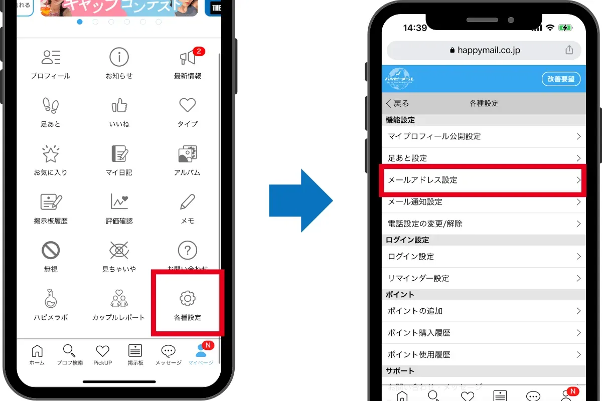 2.「マイページ」→「各種設定」をタップ